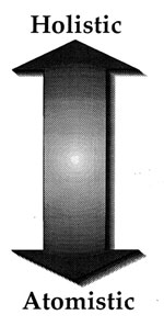 First let us add to the one-dimensional Illness/Wellness Continuum, a second continuum in a vertical dimension, showing holism in the upward direction and atomism (splitting things into their smallest recognizable components) in the downward direction - an Atomistic/Holistic Continuum.