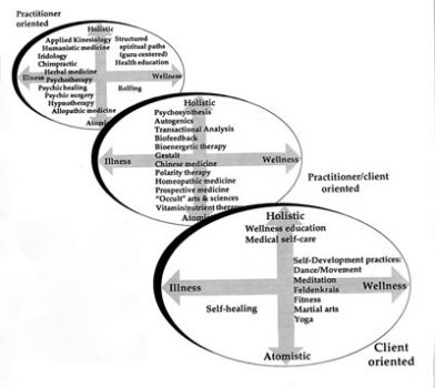 * It is tempting to make value judgments about some of these scales. We've arranged the model so that the prevailing illness care practices fall in the lower left quadrant of the rear oval. This is not done to invalidate them. We arranged the axes to represent our definitions of wellness in the most prominent quadrant because these definitions are unfamiliar to many people. All of these activities/practices are valid, and important, and meet different needs. Problems often arise because too much is expected of one discipline, e.g., if you break a bone, it is appropriate for you to find a person who can set the fracture - then you may want to look at the underlying issues which may have factored in breaking the bone.