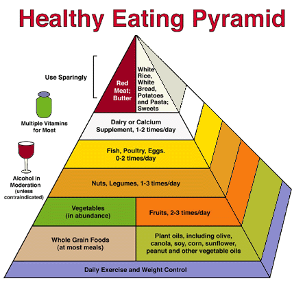 Some researchers, like Meir Stampfer, MD, DrPH, of the Harvard University School of Public Health (who served on the committee for the 2000 Guidelines update), and Walter Willett, MD, DrPH, chair of the Department of Nutrition at Harvard, think that the USDA's Food Guide Pyramid is outdated and additional changes should have been recommended. In fact, Willett's book Eat, Drink, and Be Healthy offers another pyramid model that makes more distinctions. Among the differences from the USDA model, the Harvard Healthy Eating Pyramid" puts nuts and legumes in their own category instead of lumping them together with fish, poultry, and eggs. It de-emphasizes dairy products, placing them in a category with calcium supplements. It further recommends a daily multivitamin supplement and allows for moderate alcohol consumption, as appropriate. The Harvard Pyramid Summary of Differences1. The Harvard Pyramid rests on a base of daily exercise and weight control, and it’s much more than just carbohydrates compared to fats. 2. While the top of the USDA's Pyramid, the “Use Sparingly” category, includes all fats and oils, this assumes that all fats are bad. There are big differences among saturated fats, trans-fats, and unsaturated fats. - Saturated animal fats are not as good as vegetable sources of fats, but far worse are the food industry’s trans-fats, created by bubbling hydrogen through vegetable oil. The process of hydrogenation, produces a solid fat that takes a long time to spoil. Producers want it for cookies, crackers, packaged snacks, and many other items that travel from factories to distant supermarket shelves. Fast-food restaurants use hydrogenated vegetable fat for frying. Trans-fat, is much more harmful than natural saturated fat, but many studies failed to distinguish between the two.